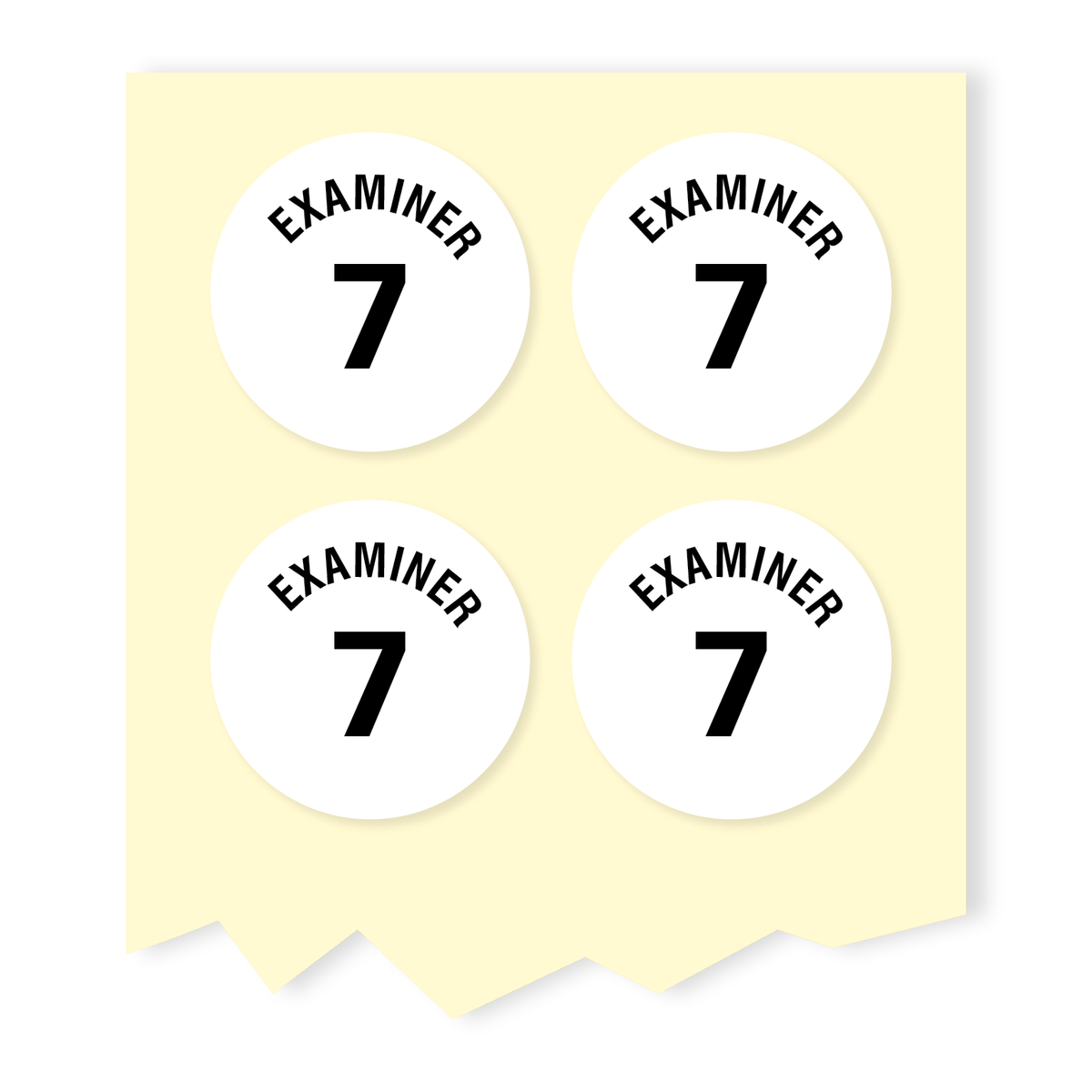Roll of 5000, 12mm diameter white self-adhesive number labels printed with ‘Examiner’ and the number in black.